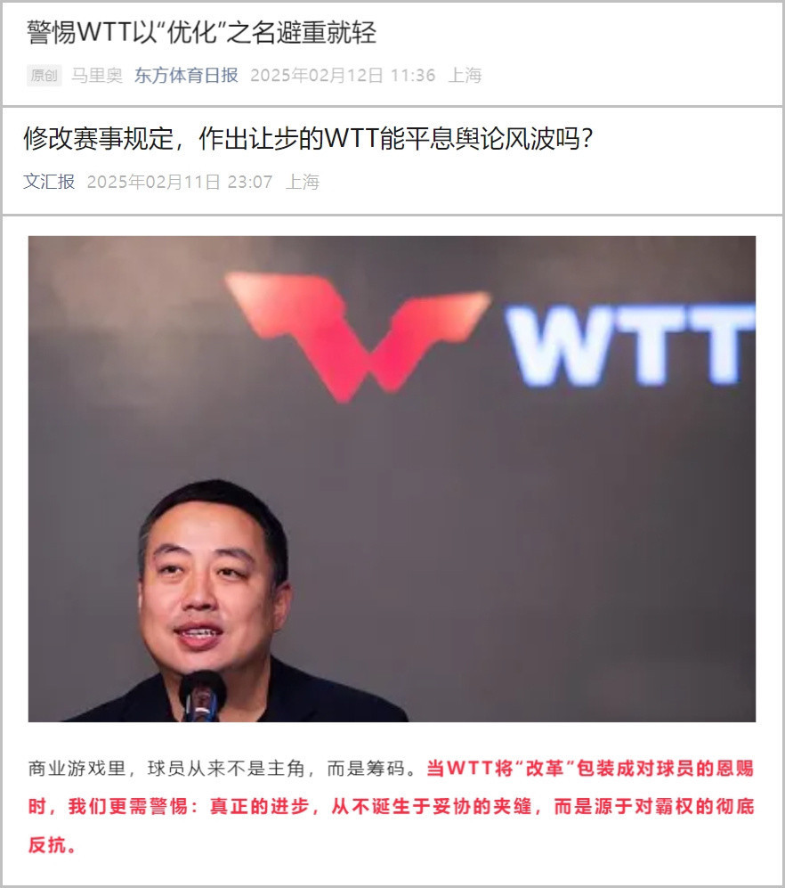 2月11日,国外乒联厚爱发布了WTT赛事的新章程,官方说这是“历史性的当先”,还对通顺员、尤其是奥运冠军示意了高度尊重,特别是那些针对奥运冠军的特等条件,径直把WTT和奥运赛事绑得更紧了,乍一听这如实挺让东谈主慷慨的,毕竟把生意赛事和奥运会挂钩,听起来就很有口头,况兼也在一定过程上平息了之前的一些争议,不外媒体这边可没这样乐不雅,岂论是央视的乒乓球记者李武军,如故上海的几家官方媒体,他们都没都备买账,反而合计这事儿没那么浅显,还在挖更深层的问题